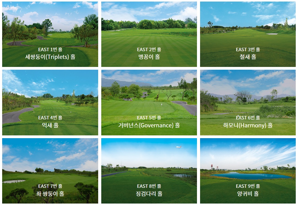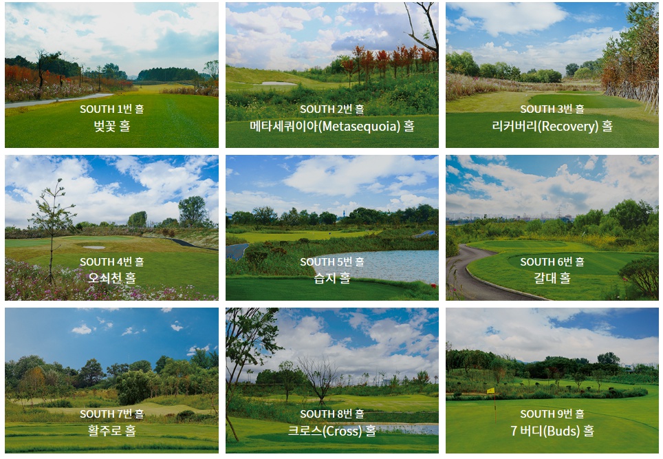 벚꽃 홀 , 메타세쿼이아 홀 , 리커버리 홀 , 오쇠철 홀 , 습지 홀 , 갈대 홀 , 활주로 홀 , 크로스 홀 , 7 버디 홀