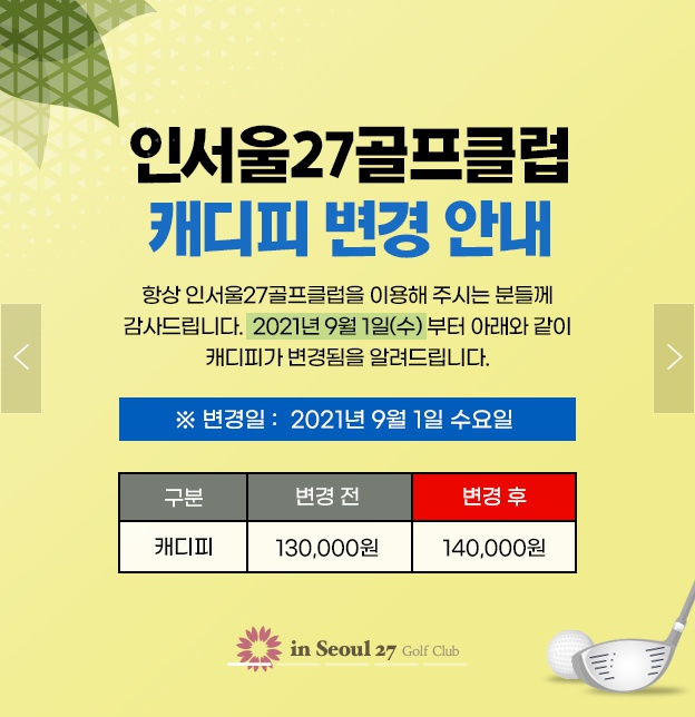 이미 인서울27골프클럽 방문 하셨던 분들은 캐디피가 변경되었으니 참고하시구요~