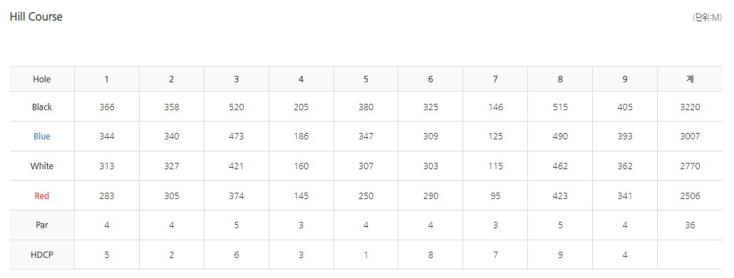 힐코스는 전장 3,220m이고 화이트티 기준으로는 길지 않은 전장이라 많이 어렵지 않게 라운딩 가능해요. 그리고 초보분들은 버디를 위해서 6번 홀과 7번 홀을 집중해야 하는데 특히 7번 파 3홀에서 꼭 버디를 노려봐요.