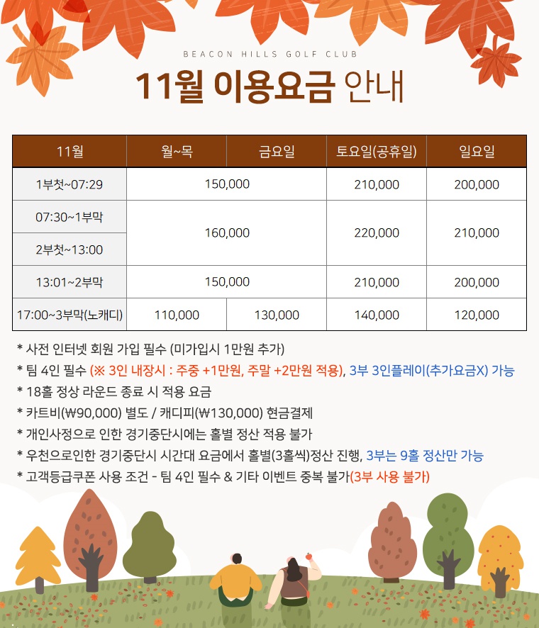 11월 비콘힐스cc 그린피는 최저 15~22만원이구요, 야간(노캐디) 에는 평일 최저 11만원이에요