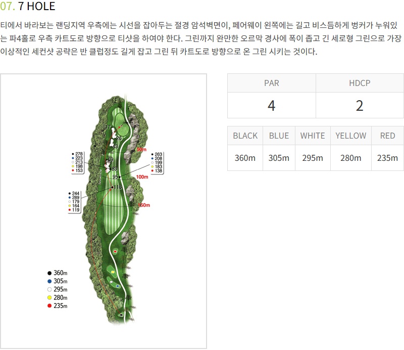 7번홀은 티샷이 너무 길면 페어웨이가 좁으므로 안전하게 가볍게 치는게 좋구요