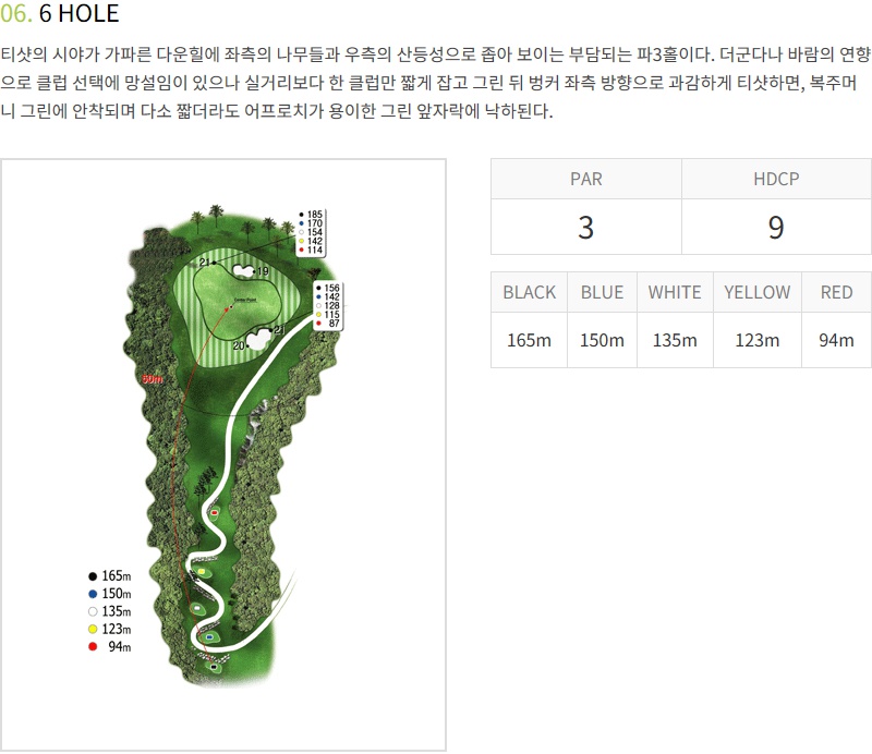 6번 파3홀이구요 화이트티 기준 135m 니까 연습장에서 많이 연습한데로 티샷하면되요